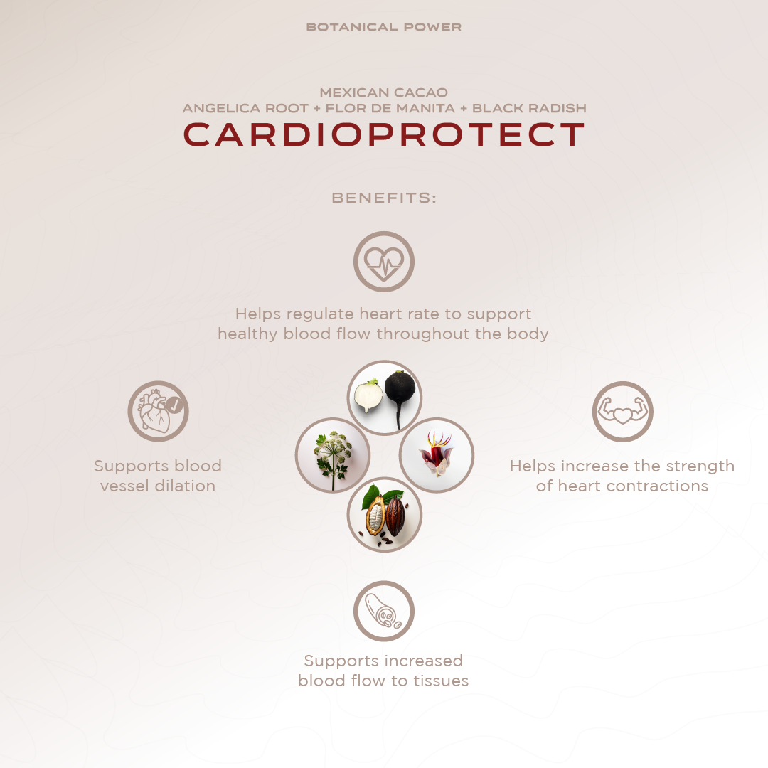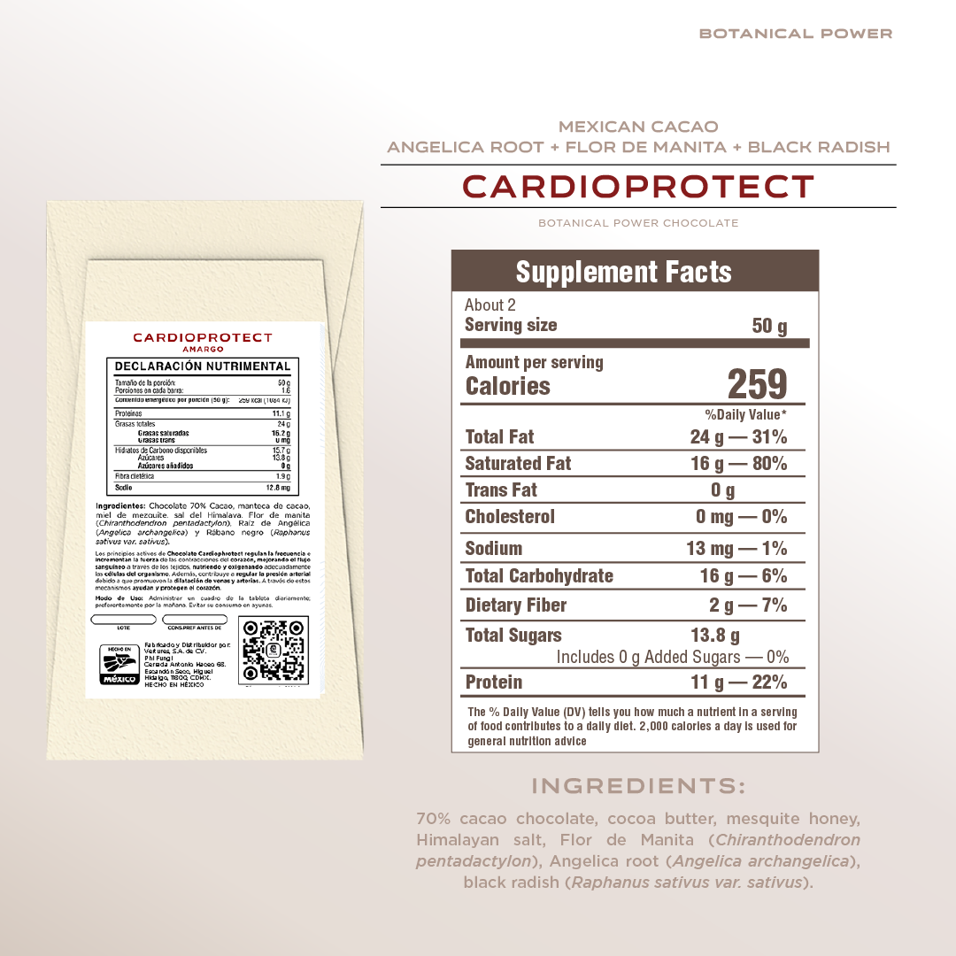 CARDIOPROTECT contains premium dark chocolate with flor de manita, angelica root, and black radish in a functional bar designed to support overall wellbeing.