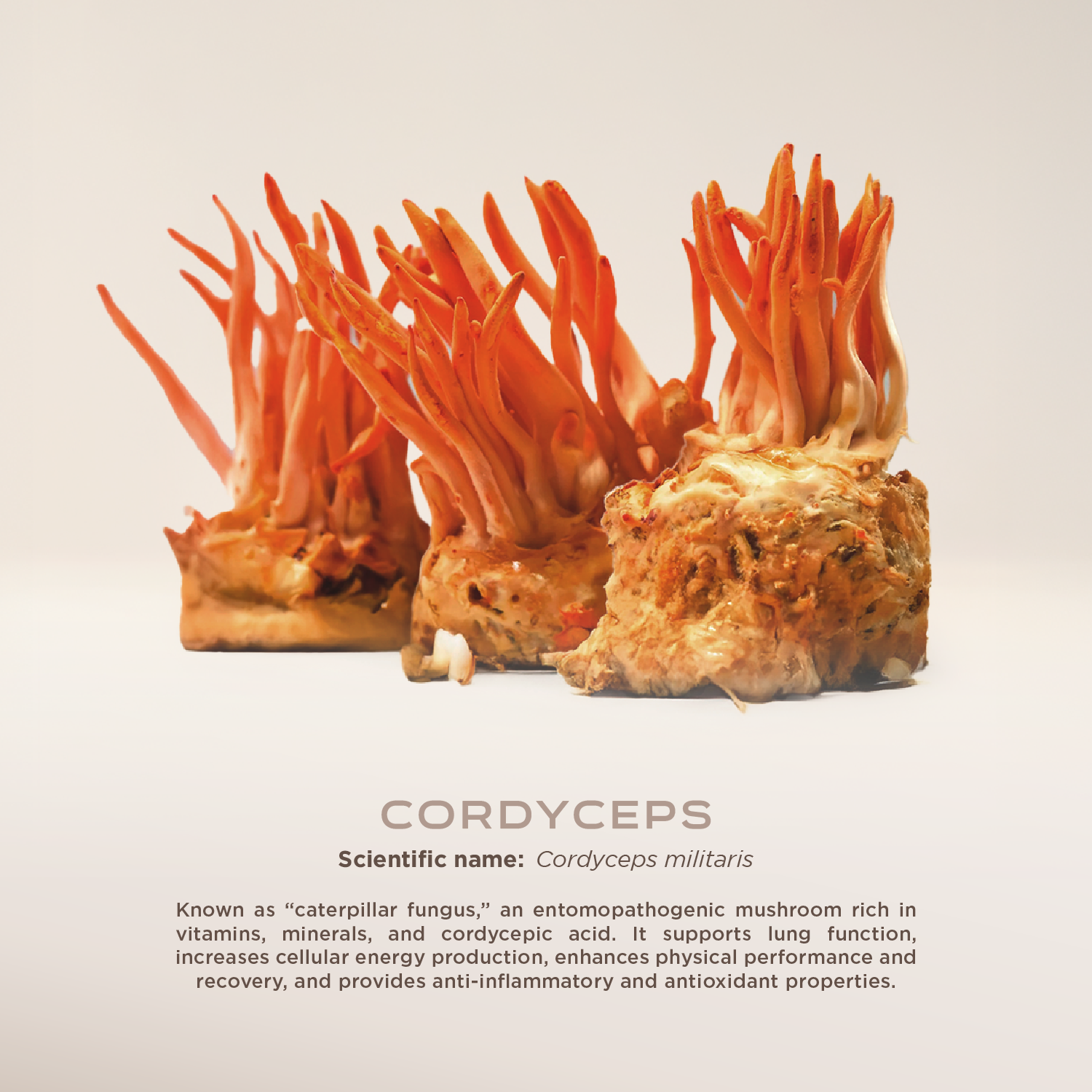 Also known as the caterpillar fungus, it is an entomopathogenic mushroom, meaning it parasitizes insects. Its compounds include cordycepic acid, glutamic acid, B-complex vitamins, vitamin E, and minerals such as sodium, potassium, calcium, copper, manganese, and selenium. It has been shown to improve lung function, promote healthy respiration, and enhance the body’s ability to use oxygen efficiently. This mushroom increases cellular energy reserves by boosting ATP production, thereby increasing muscular power and shortening muscle recovery time. It has also been demonstrated to counteract oxidative stress and reduce proteins that promote inflammation.