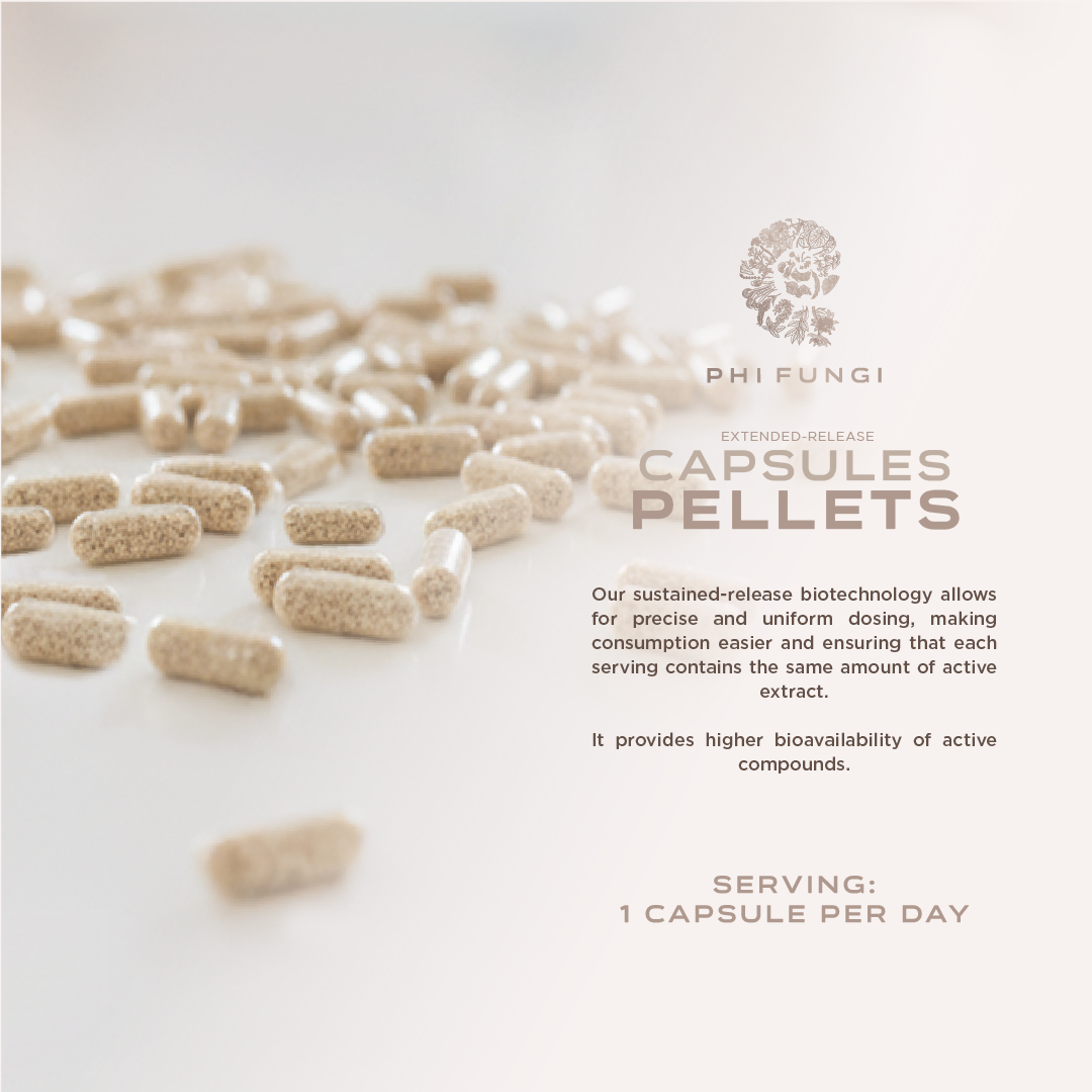 PHI FUNGI pellets are concentrated mushroom extract granules, produced under high-quality standards in Mexico City. They are obtained through a dual-extraction process and advanced pelletization technology, ensuring a stable, effective, easy-to-take product—with carefully controlled ingredients at every production stage.