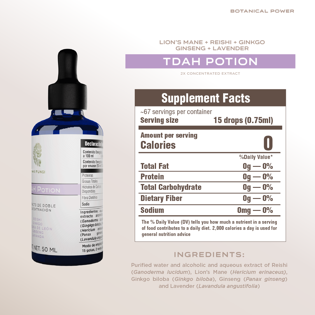 It is a formula based on functional mushrooms and botanicals designed to support central nervous system performance, balance the adaptive response, and promote overall homeostasis. It contains Ganoderma lucidum (Reishi), Hericium erinaceus (Lion's Mane), Ginkgo biloba (Ginkgo), Panax ginseng (Ginseng), and Lavandula angustifolia (Lavender).