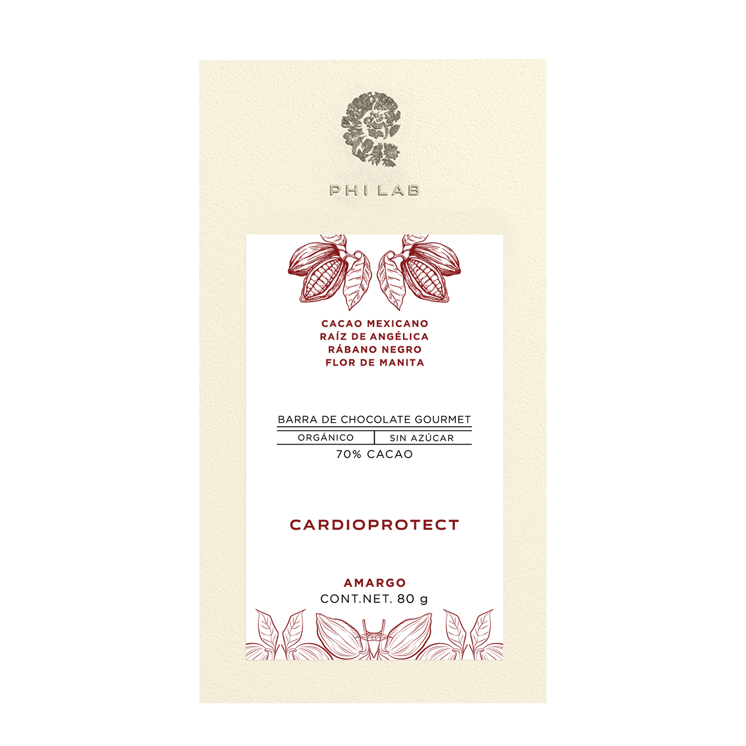 CARDIOPROTECT is a premium dark chocolate bar designed to support circulatory and heart wellbeing, featuring traditional botanicals such as flor de manita, angelica, and black radish.