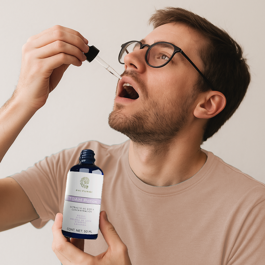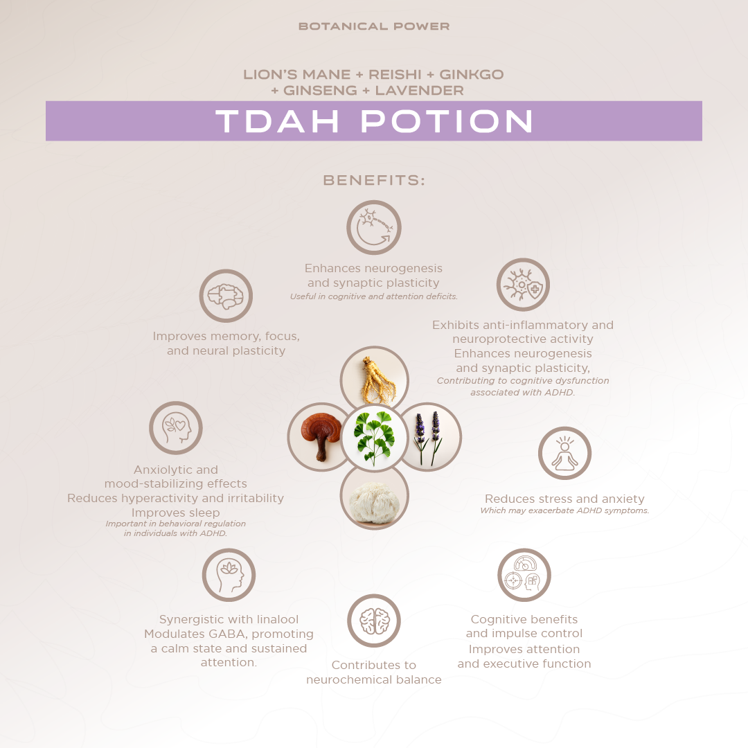 It is a formula based on functional mushrooms and botanicals designed to support central nervous system performance, balance the adaptive response, and promote overall homeostasis. It contains Ganoderma lucidum (Reishi), Hericium erinaceus (Lion's Mane), Ginkgo biloba (Ginkgo), Panax ginseng (Ginseng), and Lavandula angustifolia (Lavender).